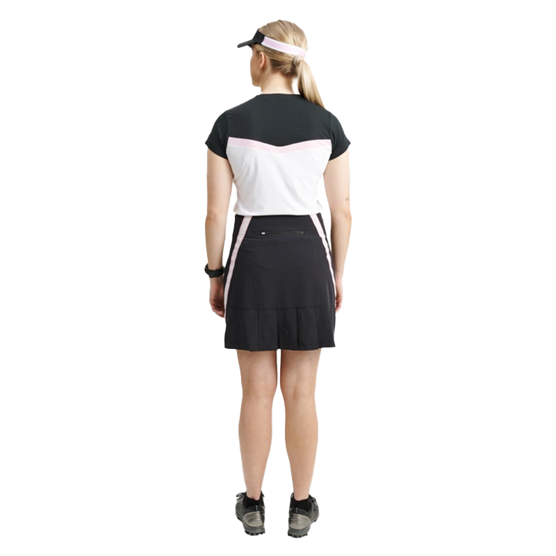 A skort with nice details. Brook skort 45cm in black is made of a functional fabric that is 4-way stretchable and breathable. The fabric also has drycool and wicking effects. One pocket with zipper in center back below waistband, pleats in back skort for extra width and contrast striped tape in light pink and white along the sides. Zipper in left hand side seam. Separate inner short in stretch mesh. Abacus logo at right hand front side hemline. The length is 45 cm. Features: