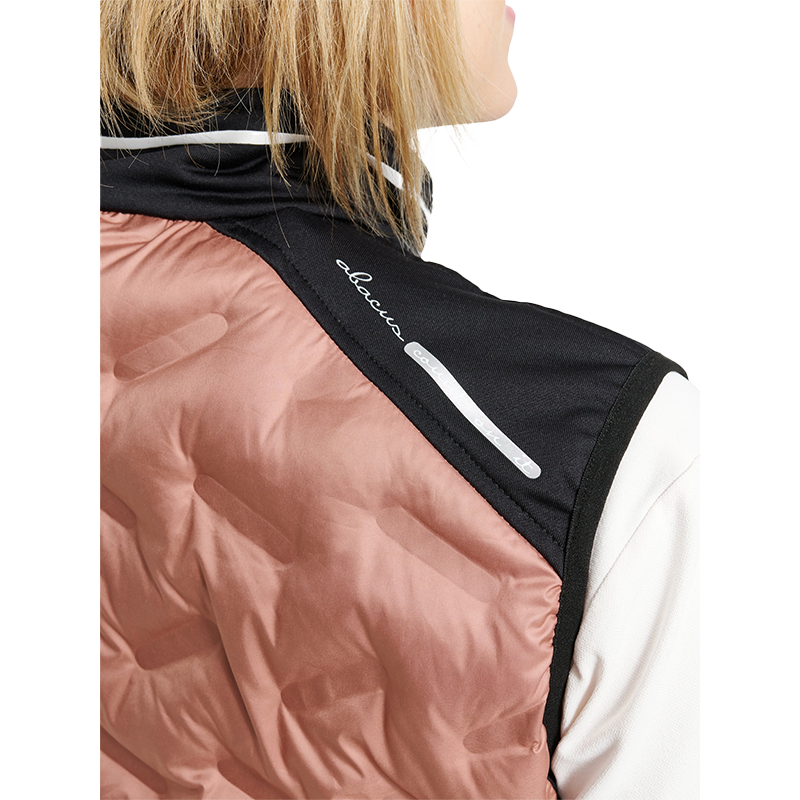 Grove hybrid vest has a seamless quilted, windproof fabric which is padded at front and back body which will keep You warm. The side panels and shoulders are made of a very stretchable fleece for better movement. Fleece is breathable and brushed on the inside. Full zipper at front and in the two front pockets with zippers aswell. Abacus logo at back right shoulder and right front body bottom. Beautiful rose gold color in combination with black and light beige details.