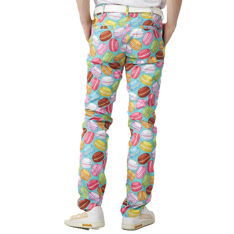 Patterned pants made of polyester twill material that allows for easy movement.