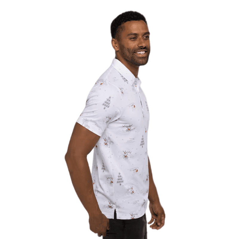 There’s nothing wrong with having a WEE BIT OF FUN this holiday season, especially when you’re wearing our festively patterned polo featuring a vacationing Santa and beer can Christmas trees.